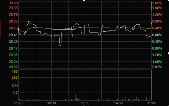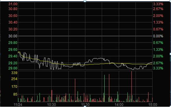 2011年11月23日临近收盘期间(14:56:24至14:59:28),任某某为了在短期内拉升股价,大量申报买入“X”4笔共计63,000股,占尾市阶段市场申买量的比例高达75.54%;委托价格由29.60元升至32.00元,每笔均高于当时市场上的买1档价格,三分钟内将股价由29.35元拉升至30元收盘,拉升幅度达2.21%。(见下图)